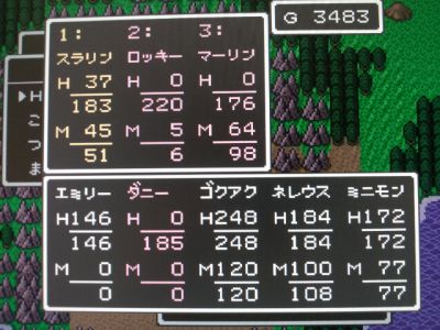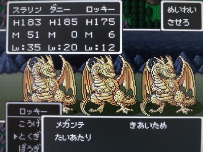 魔界の超竜・グレイトドラゴンと一度の戦闘で3匹が丸焼きに。スラリンも瀕死です。