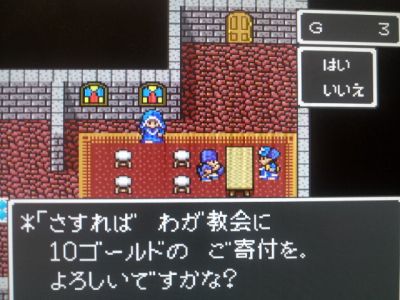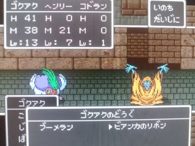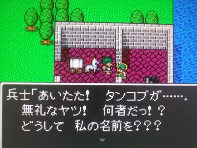 道中の敵からは全て逃げ。そしてぎりぎりラインハット城の中に進入成功!・・・なのに、中庭に配置されているドラゴンキッズに触れてしまい、「火の息」で息絶えるヘンリー。余計な手間を・・・。