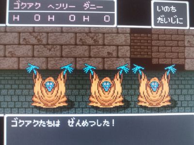 ブラウニー1匹に痛恨の一撃を連発されてしまい、ダニーが死亡。残ったベビーニュートにブラウンが撲殺され、また全滅。ここでせいすい貯金発動。これらを売って復活費用にあてます。ダニーを生き返らせるのに聖水4つも売る必要があります・・・やばい。